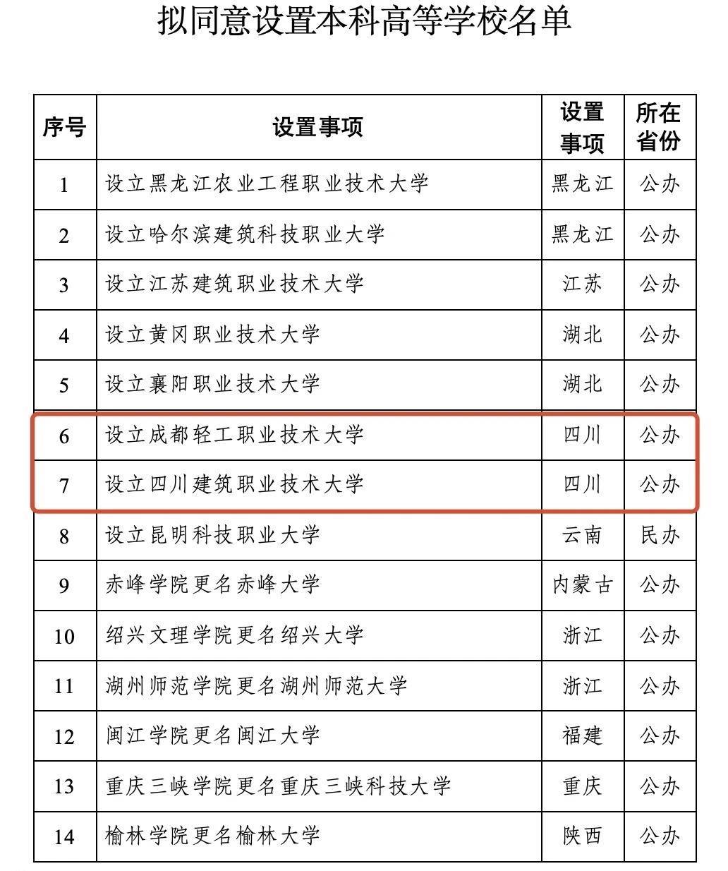 r1月12日,教育部网站发布公示,教育部拟同意设置14所本科高等学校。其中,四川有2所,分别为成都轻工职业技术大学和四川建筑职业技术大学。