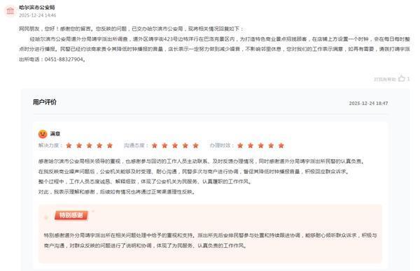 该网民对办理结果表示满意,称公安机关及时受理、耐心沟通,民警多次与商户进行协调,督促其降低时钟播报音量,积极回应群众诉求。