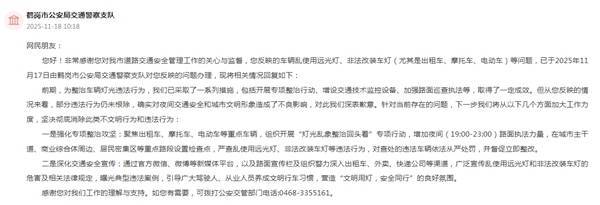鹤岗市公安局交通警察支队对网民反映的问题进行了回复,前期,为整治车辆灯光违法行为,已采取了一系列措施,包括开展专项整治行动、增设交通技术监控设备、加强路面巡查执法等,取得了一定成效。